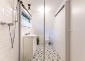 1 NP (38,4m2) – vstup na vyvýšené 1NP je zastrešený lexanom, schody sú železobetónové. Po vstupe vás privíta vstupná hala 9,3m2, v ktorej sa po pravej strane nachádza miesto na odkladanie a vstup do obývacej miestnosti 18,9m2 (3,77 x 5,01) s výstupom na terasu a po ľavej strane od vchodových dverí je samostatné WC 1,2m2. Oproti dverám je kuchyňa pozostávajúca z kuchynskej linky, chladničky jedálenského stola, príborníka. V zadnej časti je drevené schodište 4,3m2 do obytného podkrovia.