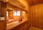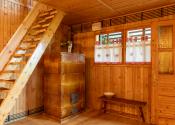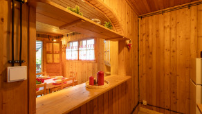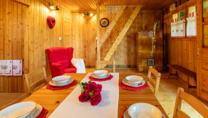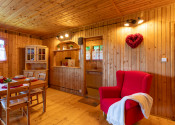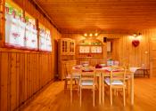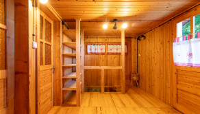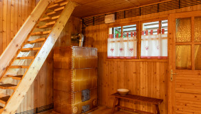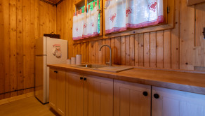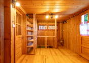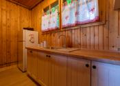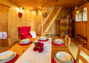 1 NP (37,4m2) – vstup do chaty je cez priestrannú zastrešenú terasu 25m2, ktorá je prekrytá novým lexanom. Po vstupe do chaty vás privíta vstupná hala - jedáleň 28,6m2 (5,77 x 5,74) za zástenou, ukrytá kuchynská linka, štýlová plne funkčná kachľová pec, kúpeľňa so sprchou a toaletou 2,9m2 ( 1,48 x 1,95) a oproti sú drevené schody do obytného podkrovia.