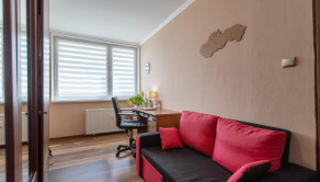 DISPOZÍCIA: Pri vstupe do chodby bytu 8,38 m2 vás upúta vstupná chodba ktorá zaujme nielen zaujímavou podlahou, ale aj podhľadom a osvetlením. Ďalej v zádverí - po pravej strane sa nachádza vstup do spálne 12 m2. Oproti vstupu je ďalšia Izba so vstavanou skriňou 11m2. Obe izby sú orientované na východ s výhľadom na detské ihrisko. Po ľavej strane je spojená kúpeľňa s WC 3,69 m2 a zároveň aj vstup do otvorenej obývacej miestnosti 25,52 m2 s eko krbom. Obývacia miestnosť je spojená s kuchyňou 6,0 m2. Vstavaná skriňa, kuchynská linka so vstavanými spotrebičmi boli vyrobená na mieru. Kuchyňa má indukciu a elektrickú rúru. Mesačné náklady - správca 180€