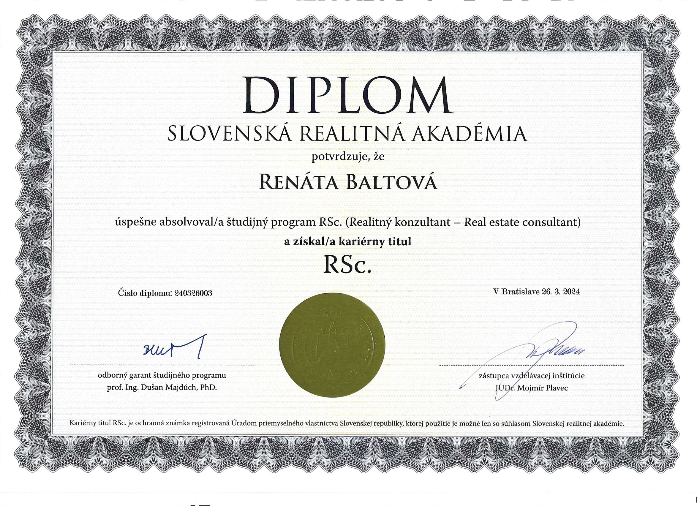 Akreditáciu realitného makléra a licenciu som získala v Akadémii Realitnej únie Slovenskej Republiky, v ktorej som aj členom Realitnej únie SR a pracujem v súlade s platnými internými smernicami, realitným a etickým kódexom a zároveň som získala najvyššie vzdelanie profesionálnych realitných poradcov na Slovensku - RSc. - real estate consultant. Absolventi sú zapísaní do verejného registra elitných realitných poradcov - absolventov študijného programu RSc.